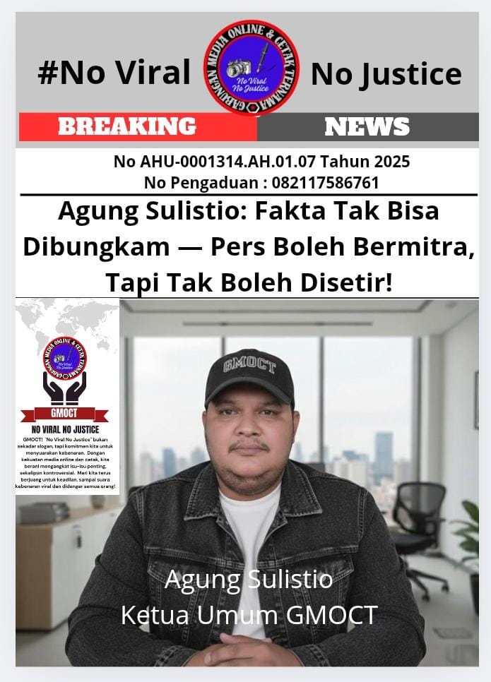 Jakarta, (GMOCT) – centralpers – Di tengah ramainya praktik kemitraan antara media dan lembaga publik, Agung Sulistio menyuarakan penolakan tegas terhadap segala bentuk intervensi yang dapat merusak independensi redaksi. Agung, yang menjabat sebagai Pimpinan Redaksi Sahabat Bhayangkara Indonesia (SBI), Ketua Umum Gabungan Media Online Cetak Ternama (GMOCT), serta Ketua II Dewan Pimpinan Pusat Lembaga Perlindungan Konsumen Republik Indonesia (LPK-RI), menekankan bahwa jurnalisme yang sesungguhnya tidak boleh menyerah pada tekanan dari pihak mana pun.