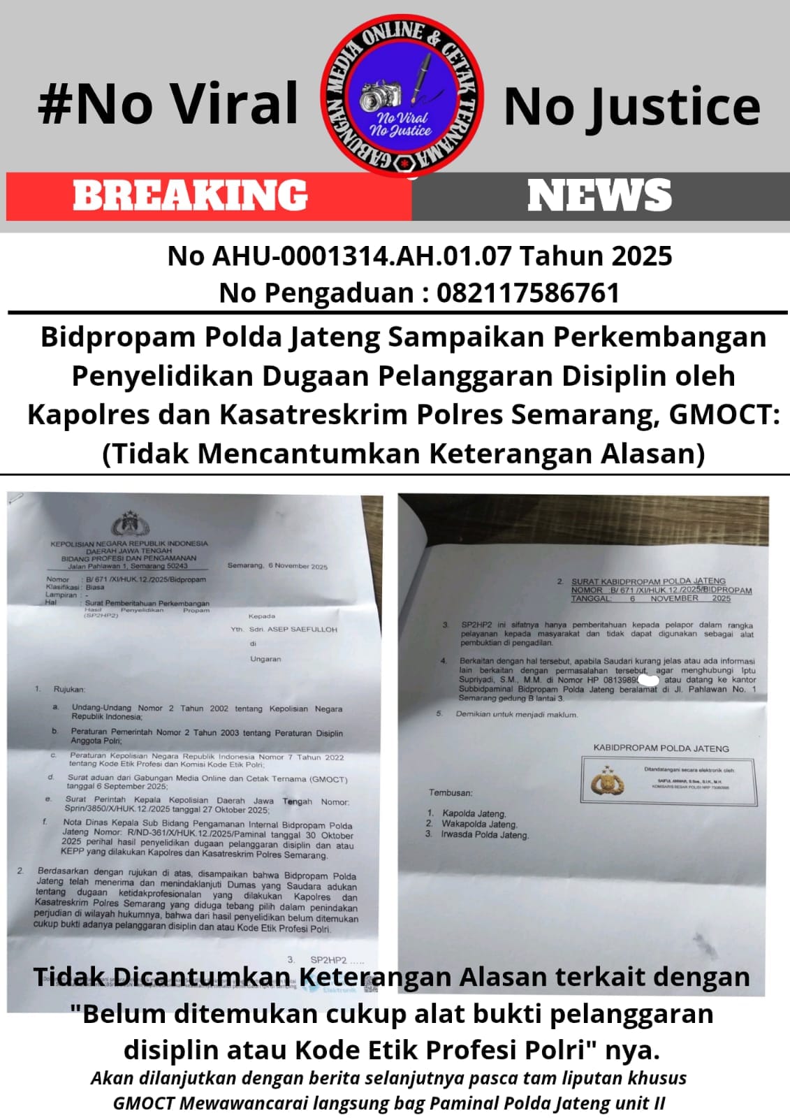 Surat ini juga merujuk pada surat aduan dari Gabungan Media Online dan Cetak Ternama (GMOCT) tanggal 6 September 2025, Surat Perintah Kepala Kepolisian Daerah Jawa Tengah Nomor Sprin/3850/X/HUK.12/2025 tanggal 27 Oktober 2025, dan Nota Dinas Kepala Sub Bidang Pengamanan Internal Bidpropam Polda Jateng Nomor R/ND-361/X/HUK.12./2025/Paminal tanggal 30 Oktober 2025.