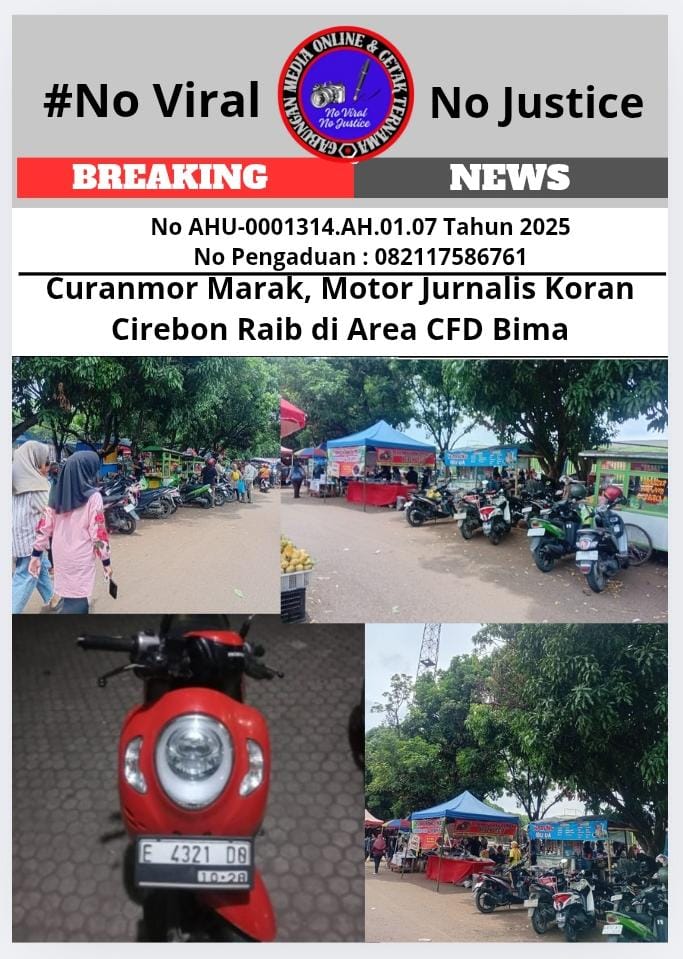Cirebon, (GMOCT) – centralpers – Aksi pencurian kendaraan bermotor (curanmor) kembali meresahkan warga Cirebon. Kali ini, menimpa seorang jurnalis Koran Cirebon, Firda Asih, yang kehilangan motor Scoopy merah hitam miliknya saat bertugas meliput kegiatan Car Free Day (CFD) di kawasan Stadion Bima, Kota Cirebon, Minggu (23/11). Gabungan Media Online dan Cetak Ternama (GMOCT) mendapatkan informasi terkait kejadian ini dari media online dan cetak Koran Cirebon yang tergabung di dalamnya.