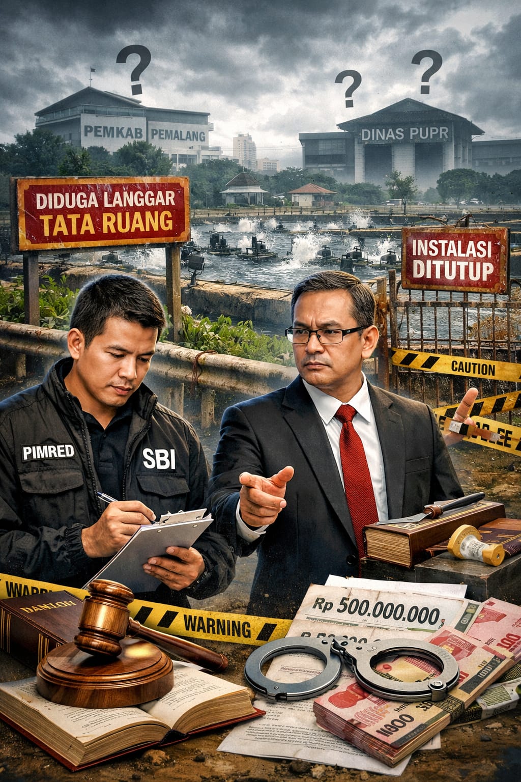 Pemalang – centralpers – Pemimpin Redaksi SBI, Agung Sulistio, bersama Bambang L.A. Hutapea, S.H., M.H., C.Med, selaku kuasa hukum Kepala Desa Nyamplungsari, Kecamatan Petarukan, Kabupaten Pemalang, secara tegas menyoroti lambannya respons Pemerintah Kabupaten Pemalang dan Dinas Pekerjaan Umum dan Penataan Ruang (PUPR) terkait keberadaan dan aktivitas tambak udang vaname yang diduga melanggar ketentuan tata ruang.