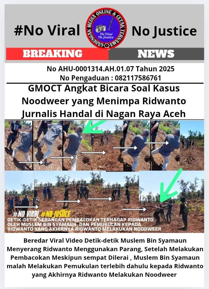Kabupaten Semarang, DPP Pusat GMOCT – centralpers – Kasus yang menimpa Ridwanto, Ketua DPD GMOCT Provinsi Aceh, yang juga seorang jurnalis, terkait dengan tindakan pembelaan diri (noodweer) menjadi perhatian serius Gabungan Media Online dan Cetak Ternama (GMOCT). Ridwanto mengalami serangan pembacokan pada 18 Agustus 2025 oleh Muslem Bin Syamaun, dan secara spontan melakukan pembelaan diri. Namun, pasca kejadian, Muslem Bin Syamaun justru melaporkan Ridwanto ke Mapolsek Darul Makmur Kabupaten Nagan Raya.