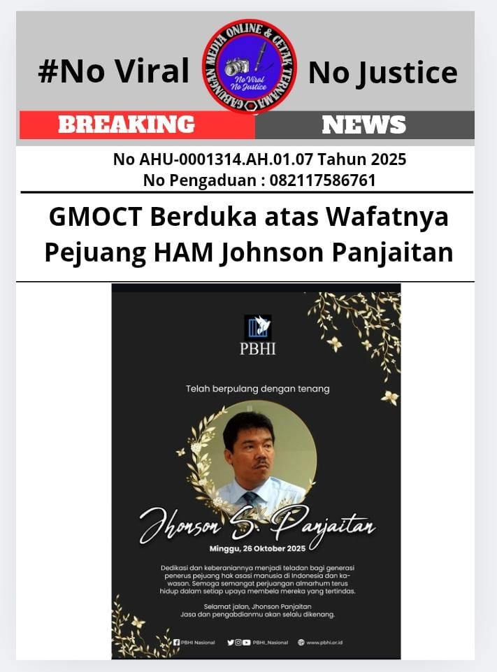 Jakarta, (GMOCT) – centralpers – Gabungan Media Online & Cetak Ternama (GMOCT) menyampaikan duka mendalam atas berpulangnya Johnson Panjaitan, mantan Ketua Perhimpunan Bantuan Hukum dan Hak Asasi Manusia Indonesia (PBHI), pada Minggu, 26 Oktober 2025. Informasi ini diterima GMOCT dari media online Jelajahperkara yang tergabung dalam jaringan GMOCT.