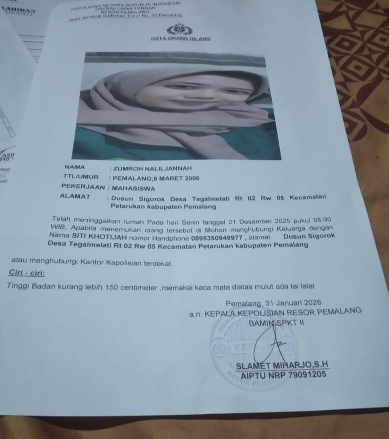 Pemalang – centralpers – Selasa 3 Februari 2026 Pimpinan Redaksi Sahabat Bhayangkara Indonesia (KABARSBI.COM), Agung Sulistio, menerima kedatangan seorang ibu bernama Siti Khotijah yang memohon bantuan publikasi terkait hilangnya putrinya. Dengan penuh harap dan rasa cemas, Ibu Siti meminta agar media KABARSBI.COM membantu menyebarluaskan informasi pencarian demi mempercepat ditemukannya sang anak.