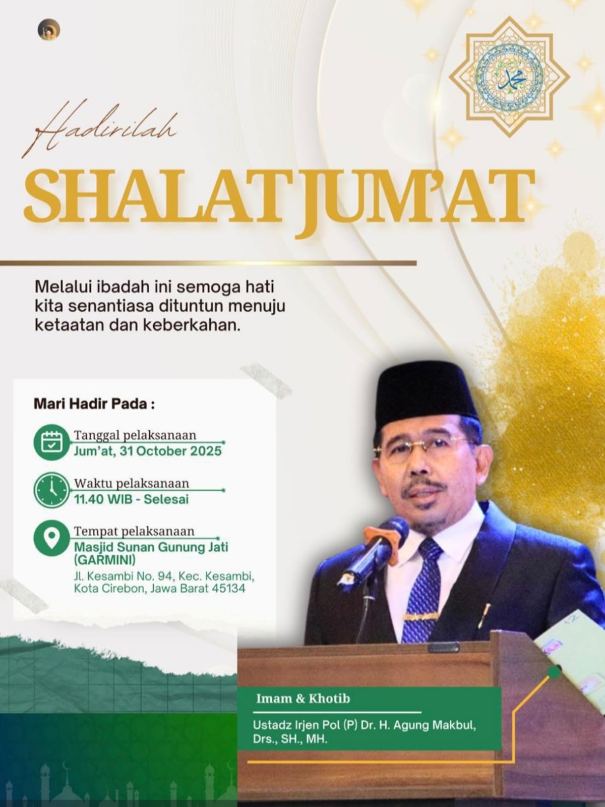 Menutup pesannya, Irjen Pol (P) Dr. H. Agung Makbul mengajak seluruh elemen bangsa untuk menjadikan setiap Jumat sebagai hari pembaruan nurani. “Refleksi diri adalah langkah pertama menuju perbaikan bangsa. Mulailah dari diri sendiri, dari hal kecil, dengan niat tulus dan hati yang bersih,” katanya. Pesan itu menjadi pengingat bahwa keberkahan Jumat seharusnya tak hanya dirasakan secara ritual, tetapi juga diwujudkan dalam tindakan nyata demi kemaslahatan bersama.