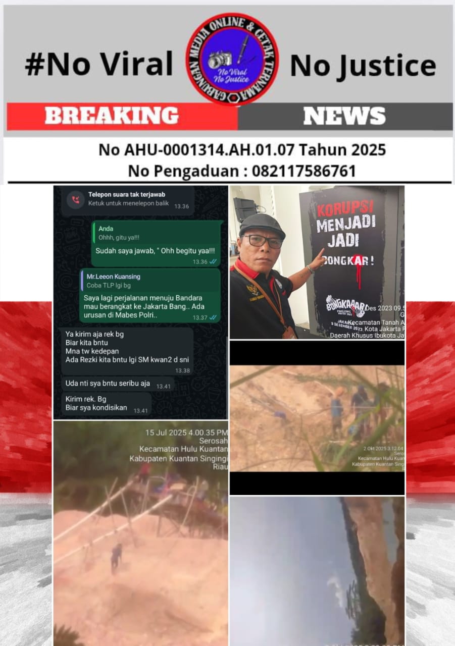 Diungkapkan Rahmad, keyakinannya bahwa apa yang dilakukan Kapolsek Hulu Kuantan hanya sekedar formalitas, karena pada Senin (06/10/2025) dirinya berusaha diiming-imingi sejumlah uang oleh seseorang yang sering disapa Leon, diduga merupakan “kaki tangan” dari Pemilik PETI.