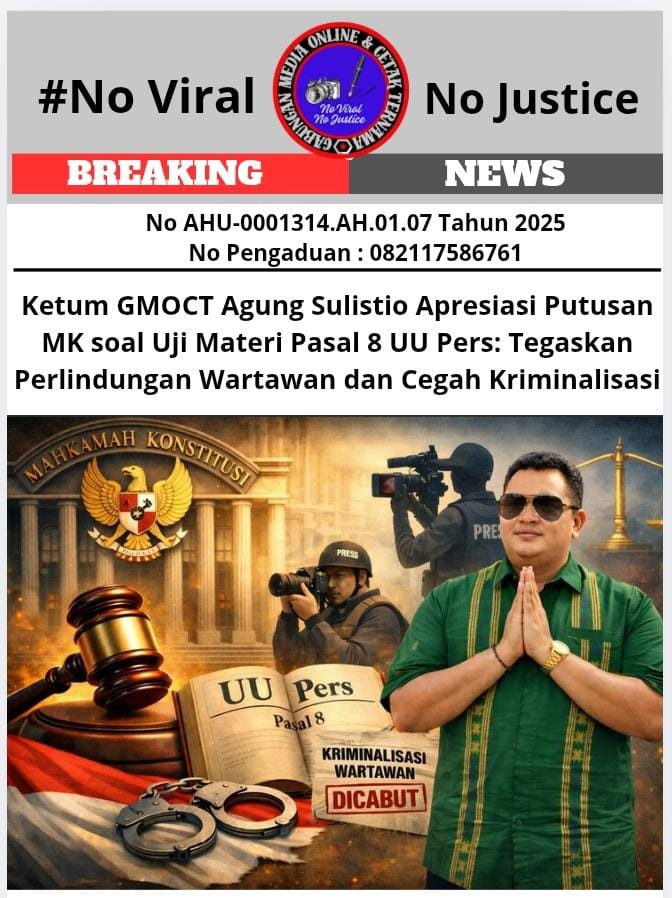 Jakarta, (GMOCT) – centralpers – Agung Sulistio, selaku Ketua Umum Gabungan Media Online dan Cetak Ternama (GMOCT), Pimpinan Redaksi Sahabat Bhayangkara Indonesia (Kabarsbi.com), serta Ketua II DPP Lembaga Perlindungan Konsumen Republik Indonesia (LPK-RI), menyoroti secara serius hasil Putusan Mahkamah Konstitusi yang mengabulkan sebagian permohonan uji materi terhadap Pasal 8 Undang-Undang Nomor 40 Tahun 1999 tentang Pers. Informasi terkait putusan ini diperoleh GMOCT dari media online Kabarsbi yang tergabung di dalam organisasi tersebut. Putusan ini dinilai sebagai tonggak penting dalam memperkuat kepastian hukum bagi insan pers di Indonesia.
