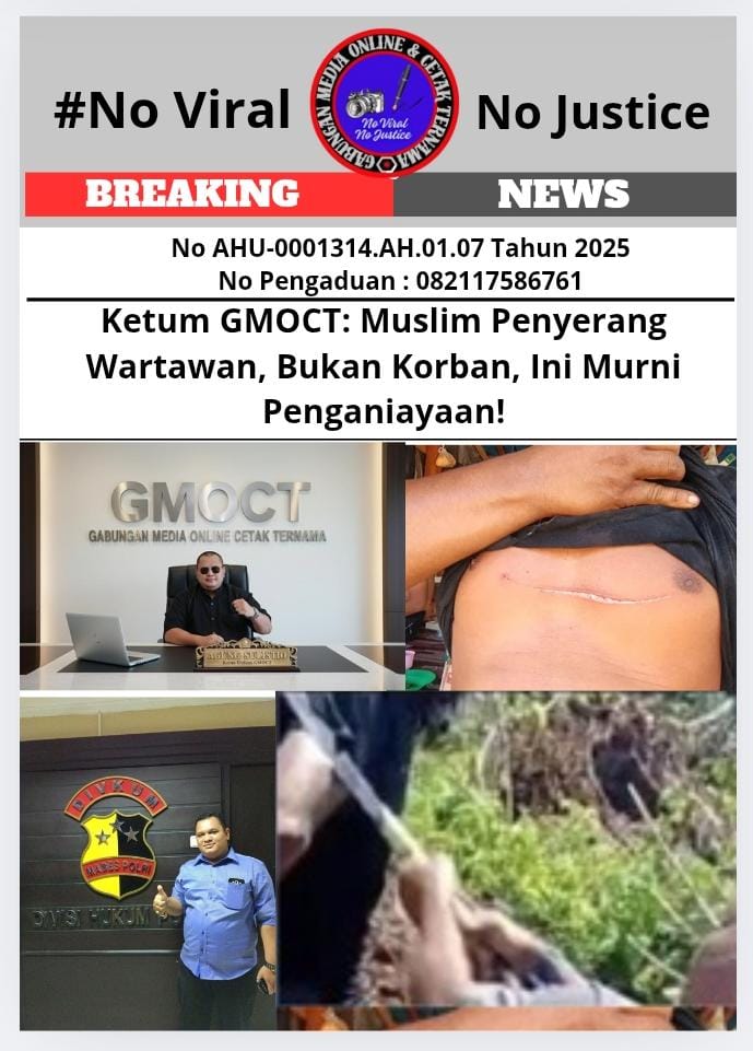 Jakarta, (GMOCT) – centralpers – Ketua Umum Gabungan Media Online dan Cetak Ternama (GMOCT), Agung Sulistio, memberikan tanggapan keras atas pernyataan kuasa hukum Muslem, pelaku pembacokan terhadap Ridwanto, Ketua DPD GMOCT Provinsi Aceh. Agung menegaskan bahwa fakta hukum menunjukkan Muslem adalah penyerang, bukan korban, dan tindakan tersebut murni penganiayaan.