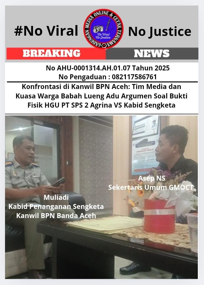 Banda Aceh, (GMOCT) – centralpers – Suasana tegang mewarnai Kantor Wilayah Badan Pertanahan Nasional (Kanwil BPN) Banda Aceh pada Senin (13/10/2025) siang. Tim liputan khusus dari Gabungan Media Online dan Cetak Ternama (GMOCT) bersama perwakilan warga Desa Babah Lueng, Kecamatan Tripa Makmur, Kabupaten Nagan Raya, terlibat adu argumentasi dengan Kepala Bidang Sengketa Kanwil BPN Aceh, Muliadi.