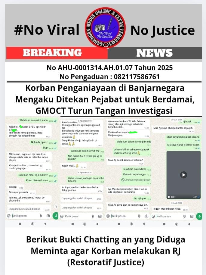Banjarnegara, (GMOCT) – centralpers – Aji Setyawan, warga Banjarnegara yang menjadi korban penganiayaan, mengungkapkan adanya dugaan tekanan dari sejumlah pejabat daerah agar dirinya berdamai dengan pelaku. Informasi ini didapatkan oleh tim liputan khusus GMOCT (Gabungan Media Online dan Cetak Ternama).