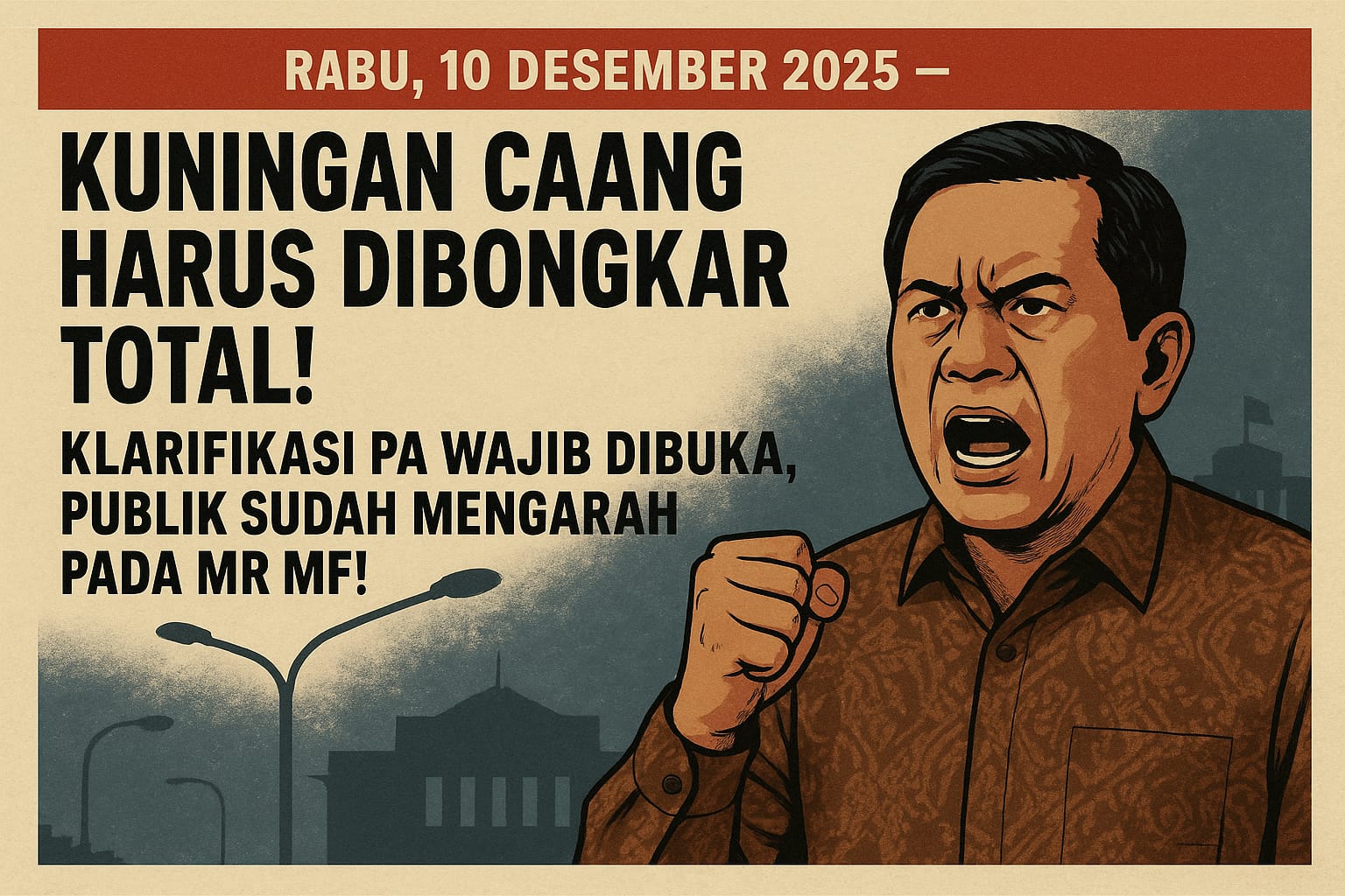 Kuningan – centralpers – Ketua Umum GMOCT sekaligus Pemimpin Redaksi Sahabat Bhayangkara Indonesia Kabarsbi.com, Agung Sulistio, mengeluarkan pernyataan paling keras terkait proyek PJU “Kuningan Caang” di Kabupaten Kuningan. Agung menyebut bahwa proyek ini kini bukan lagi sekadar isu teknis, melainkan telah berubah menjadi simbol carut-marut tata kelola yang dibiarkan tanpa jawaban. “Ketika pemerintah bungkam, publik berhak bersuara lantang. Dan saat publik bersuara, pemerintah wajib menjawab!” tegasnya.