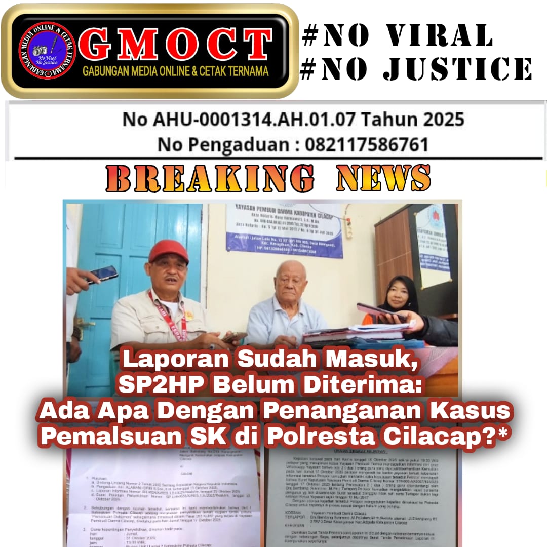 Cilacap, (GMOCT) – centralpers – Penanganan dugaan pemalsuan Surat Keputusan (SK) pemberhentian dua guru di Yayasan Pembudi Darma Cilacap menjadi sorotan. Ketua Yayasan, Albani Idris, S.Sos., S.H., mempertanyakan perkembangan laporan yang telah ia ajukan ke Polresta Cilacap, menyusul belum diterimanya Surat Pemberitahuan Perkembangan Hasil Penyidikan (SP2HP) maupun salinan Laporan Polisi (LP).