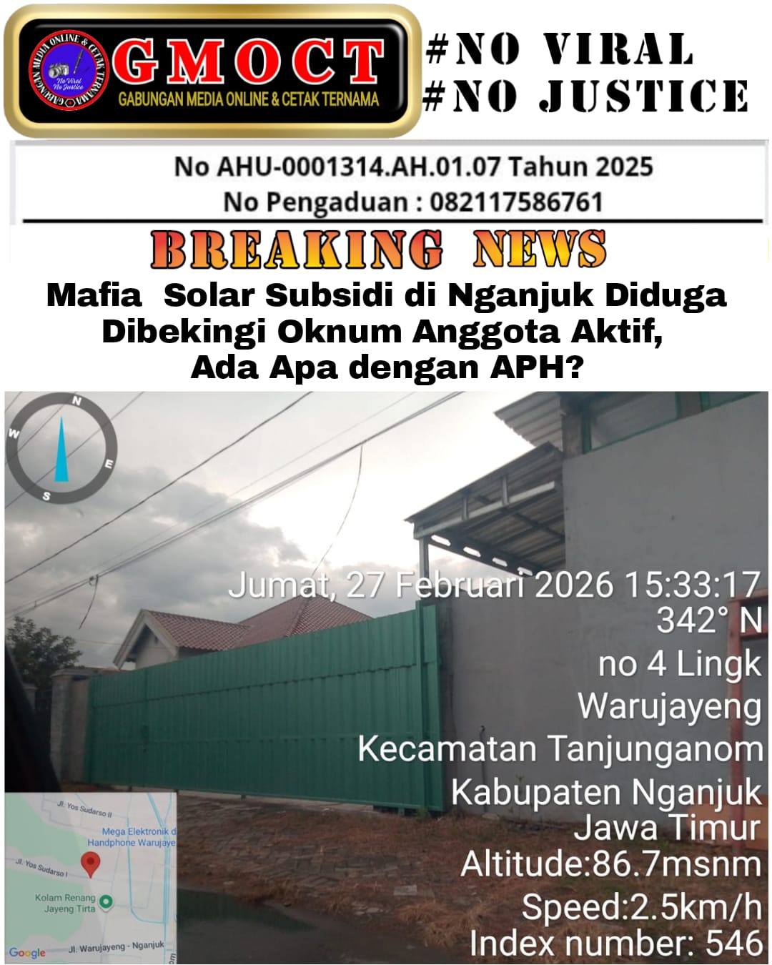 Nganjuk, (GMOCT) – centralpers – Sebuah gudang berlokasi di Desa Warujayeng, Kecamatan Tanjung Anom, Kabupaten Nganjuk, Jawa Timur, diduga menjadi sarana penimbunan solar bersubsidi. Aktivitas ilegal yang terkait dengan seorang pengusaha berinisial L ini masih menunggu pendalaman dan konfirmasi resmi dari aparat penegak hukum.