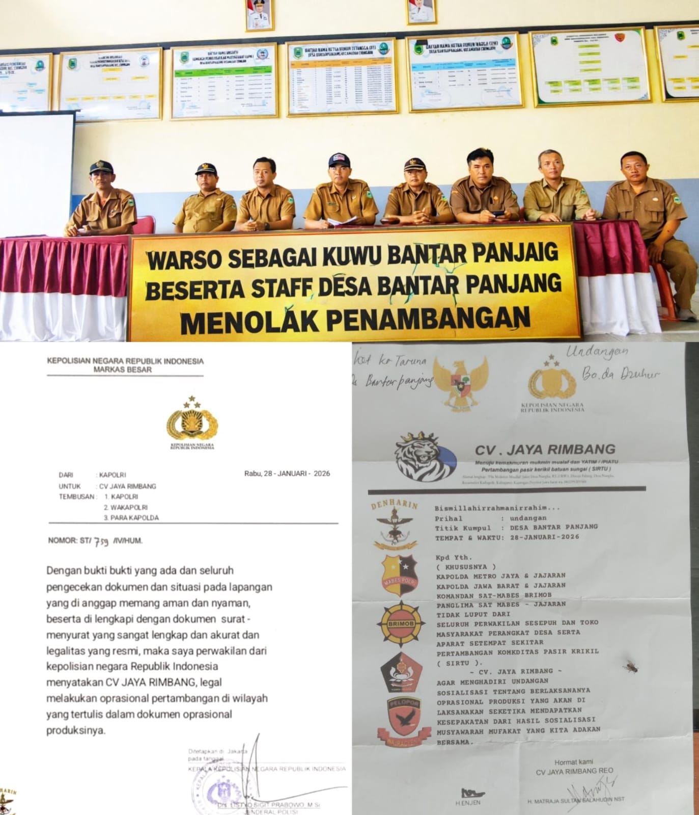 Surat tertanggal 28 Januari 2026 itu berisi undangan sosialisasi kegiatan pertambangan oleh CV Jaya Rimbang di Balai Desa Bantarpanjang. Dalam dokumen tersebut tercantum sejumlah logo dan atribut, antara lain DENHARIN, MABES POLRI, BRIMOB, dan PELOPOR.