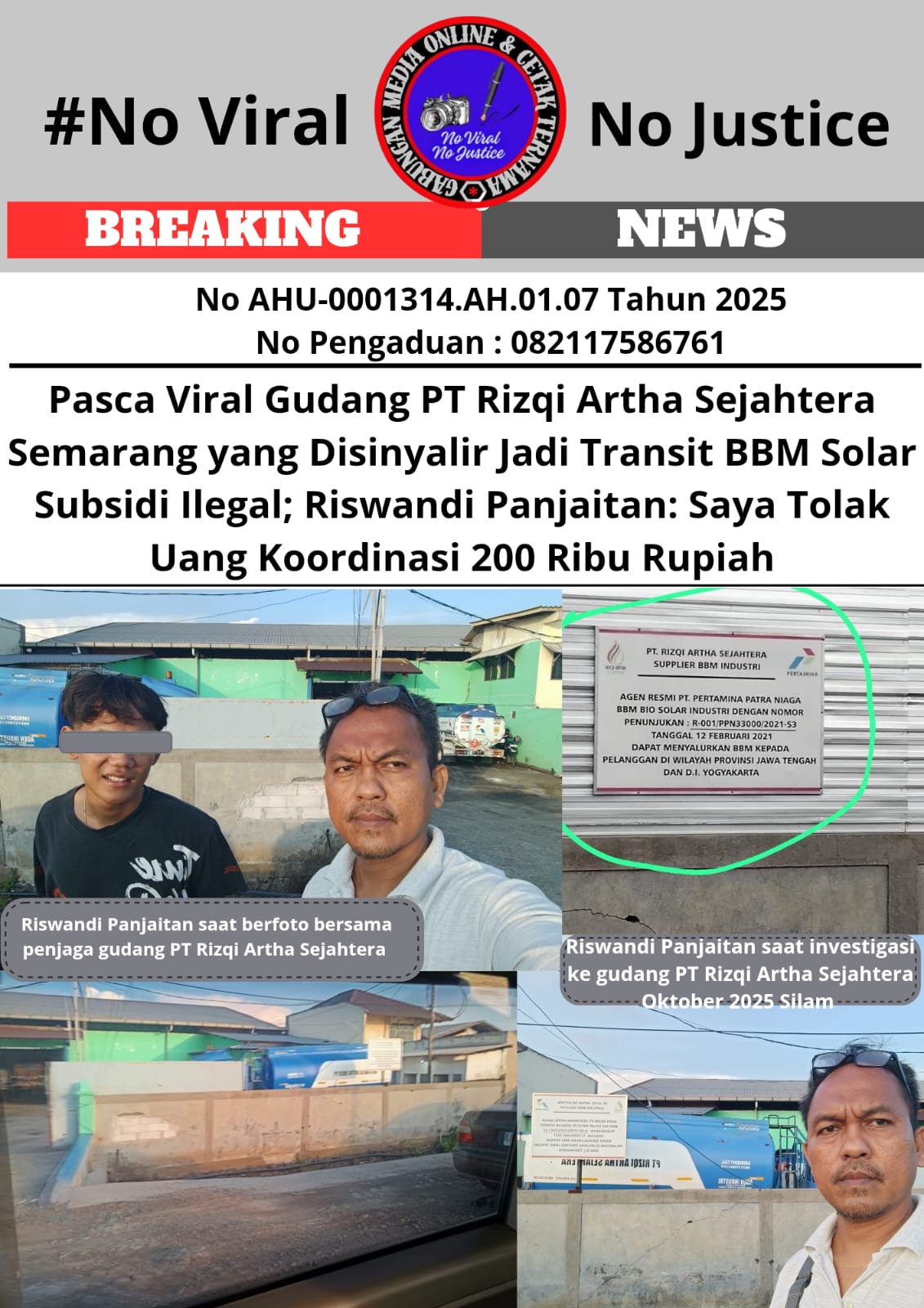 Semarang, (GMOCT) – centralpers – Pemberitaan tentang dugaan gudang milik PT Rizqi Artha Sejahtera di Kawasan Terminal Terboyo Semarang yang menjadi transit BBM solar subsidi ilegal telah viral di puluhan media online dan cetak yang tergabung dalam GMOCT (Gabungan Media Online dan Cetak). Berita yang mengambil judul “Ditemukan Papan Tanda Resmi Pertamina, Namun Gudang PT Rizqi Artha Sejahtera Disinyalir Jadi Transit BBM Solar Bersubsidi Ilegal; Banyak Oknum Wartawan Diduga Dibayar 200 Ribu Rupiah untuk Koordinasi” mengundang perhatian publik, terutama setelah salah satu pemilik foto yang awalnya diduga sebagai wartawan penerima uang mengangkat bicara.