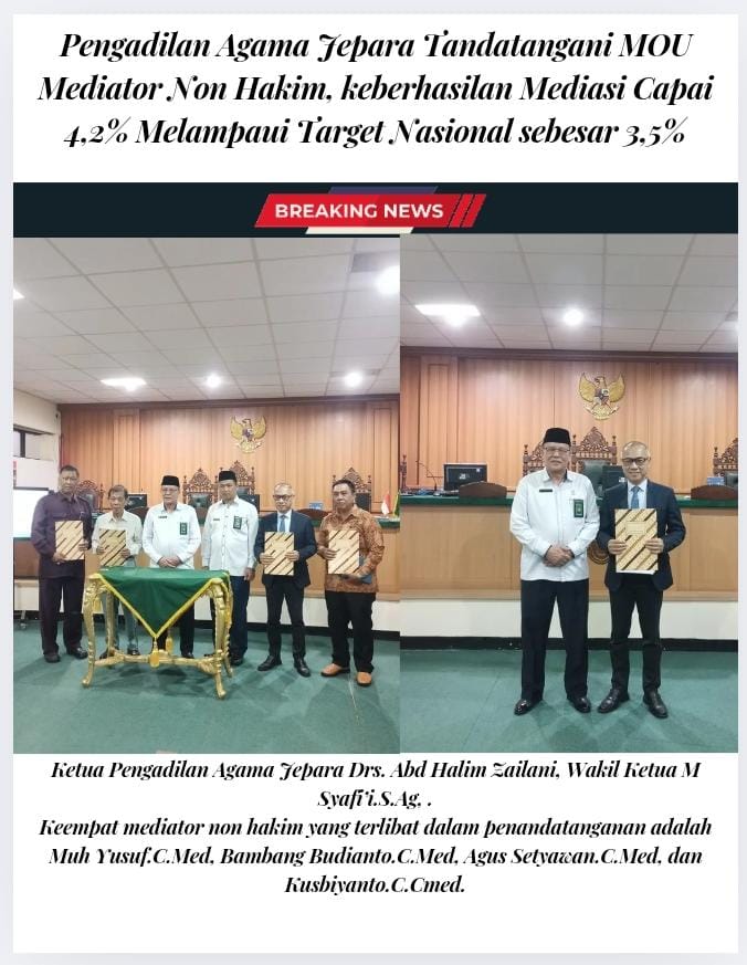 Dilaporkan bahwa tingkat keberhasilan mediasi di Pengadilan Agama Jepara tahun 2025 mencapai 4,2%, melampaui target nasional yang ditetapkan sebesar 3,5%. Kerjasama ini diharapkan dapat semakin meningkatkan kualitas dan efektivitas proses mediasi untuk kepentingan masyarakat.