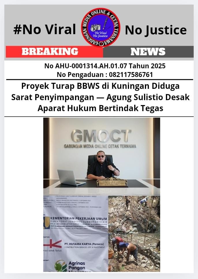 Kuningan, (GMOCT) – centralpers – Dugaan penyimpangan pada proyek Turap/TPT Sungai di Desa Dukuh Lor, Sindang Agung, Kabupaten Kuningan, Jawa Barat, yang dibiayai APBN melalui BBWS Cimanuk–Cisanggarung senilai Rp36,8 miliar, mendapat sorotan tajam dari berbagai pihak.