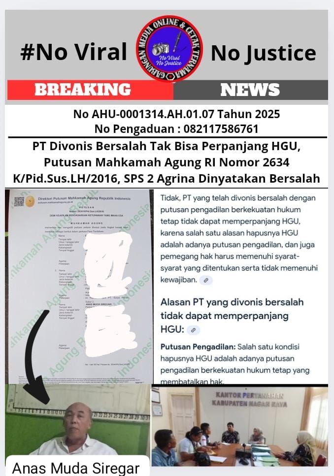 Nagan Raya, Aceh (GMOCT) – centralpers – Putusan Mahkamah Agung RI Nomor 2634 K/Pid.Sus.LH/2016 menjadi sorotan dalam sengketa lahan antara PT SPS 2 Agrina dengan warga Desa Babahlueng, Nagan Raya. Kasus ini kembali mencuat seiring dengan klaim PT SPS 2 Agrina yang masih mengklaim memiliki izin Hak Guna Usaha (HGU) di desa tersebut, meskipun perusahaan tersebut telah divonis bersalah berdasarkan putusan pengadilan yang berkekuatan hukum tetap.