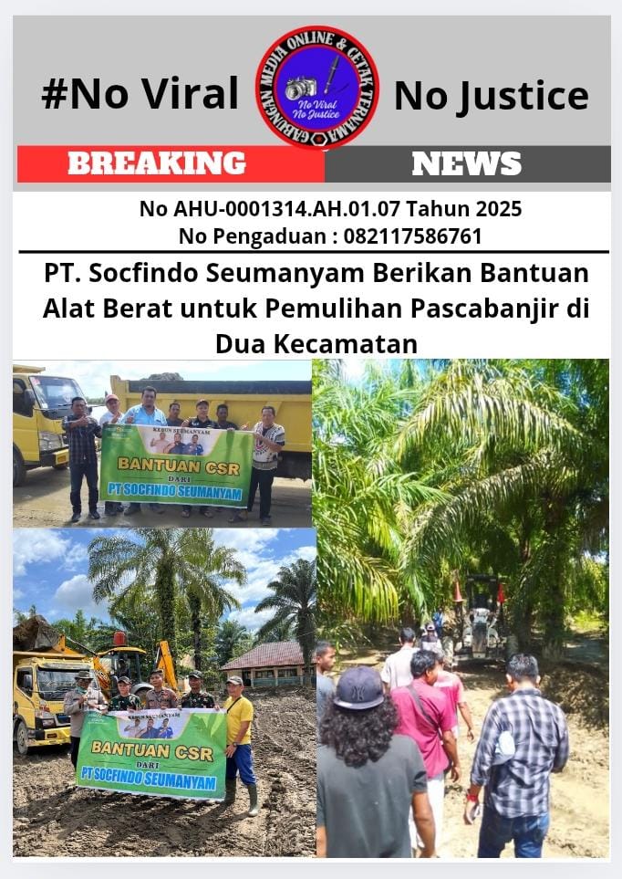 Seumanyam, (GMOCT) – centralpers – PT. Socfindo Kebun Seumanyam memberikan bantuan dua alat berat, yaitu Bachoe Loader dan Road Grader, untuk mendukung pemulihan pasca banjir bandang di Kecamatan Darul Makmur dan Tripa Makmur, Sabtu (20/12/2025). Bantuan ini ditujukan untuk memulihkan sarana pendidikan dan akses jalan yang terganggu akibat bencana pada 26 November 2025 lalu.