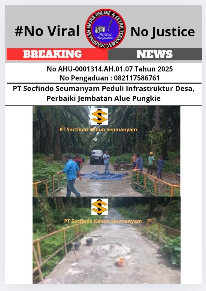 Nagan Raya, Aceh (GMOCT) – centralpers – PT Socfindo Seumanyam menunjukkan komitmennya terhadap masyarakat sekitar dengan memperbaiki jembatan lintas Desa Alue Pungkie (Gunong Kong), Kecamatan Darul Makmur, Kabupaten Nagan Raya. Perbaikan ini merupakan wujud tanggung jawab sosial perusahaan (CSR) yang berkelanjutan.