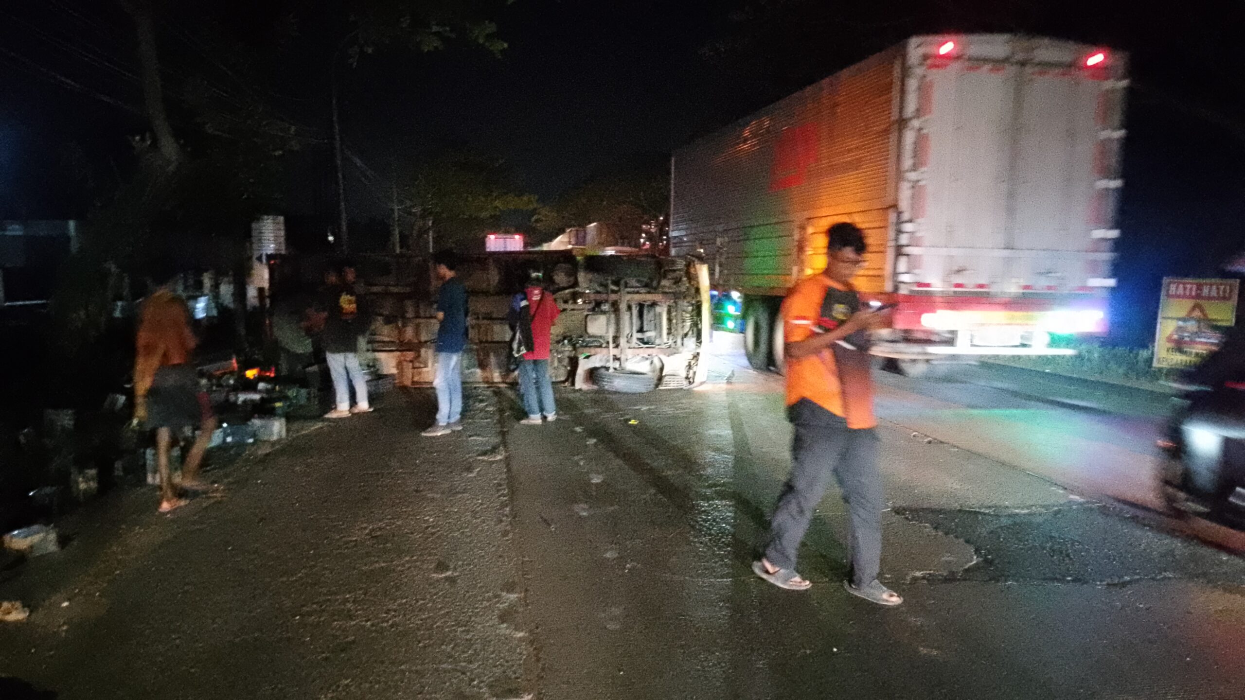 Pati – centralpers – Kecepatan respons Kepolisian kembali ditunjukkan oleh jajaran Polsek Juwana. Anggota piket Satlantas Polsek Juwana bergerak taktis menangani gangguan lalu lintas akibat sebuah truk box bermuatan accu mengalami pecah ban belakang sebelah kiri, dari arah Barat menuju ke Timur tepatnya di Sebelah barat gapura desa Gadingrejo kecamatan Juwana. Truk naas tersebut terguling dan menutupi separo dari ruas jalan Pantura Pati – Juwana. Kejadian terjadi pada hari Kamis kurang lebih sekitar jam 20.30 WIB.