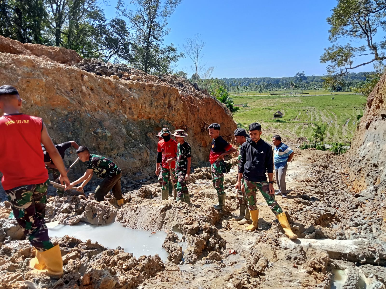 Kerja dilakukan tanpa banyak menunggu. Setiap ayunan alat menjadi langkah kecil yang menjaga jalan tetap berfungsi sebagai penghubung aktivitas warga desa. Kebersamaan antara prajurit dan masyarakat terlihat jelas, menghadirkan suasana kerja yang ringan meski medan cukup berat.
