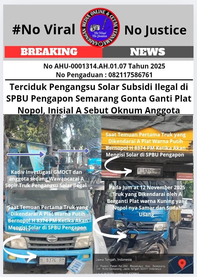 Penelitian yang dilakukan tim investigasi GMOCT menemukan praktik ilegal di SPBU 44.501.16 yang berada di Jl. Pengapon No.14, Kemijen, Kecamatan Semarang Timur, Jawa Tengah, pada hari Jumat (12/12/2025). Di lokasi tersebut, terpantau satu unit mobil truk tenda berwarna biru kuning dengan nopol H 8374 PM yang telah dimodifikasi tangkinya sedang mengisi solar subsidi dalam jumlah hingga ribuan liter.