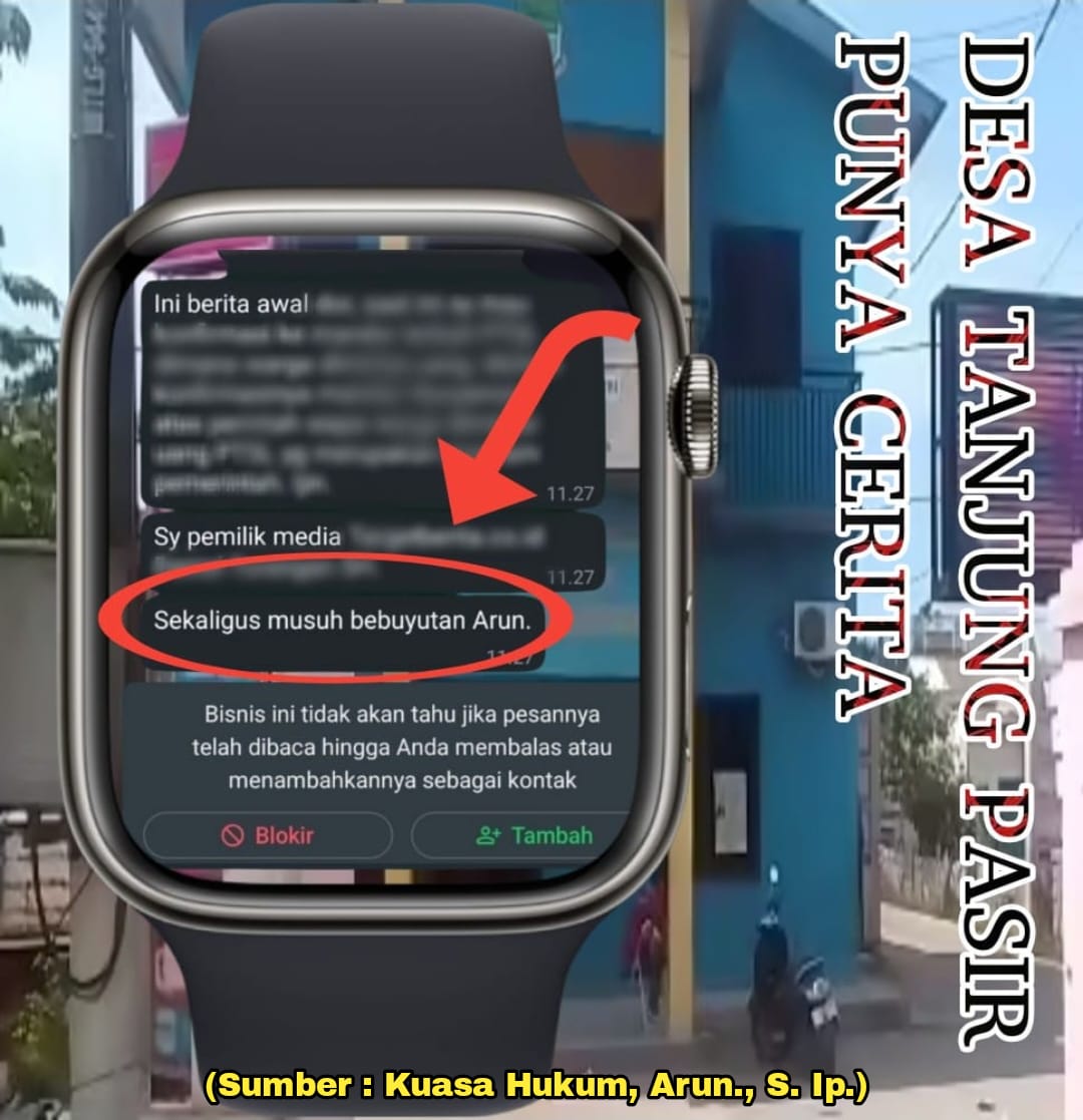 “Pernyataan tersebut terbukti dari ditemukannya bukti Chat oknum yang bersangkutan inisial DT yang menyebutkan beliau merupakan pemilik media sekaligus Musuh Bebuyutan dari Kades Tanjung Pasir Arun,S.Ip”.Jelasnya.
