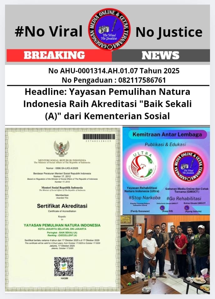 Jakarta, (GMOCT) – centralpers – Yayasan Pemulihan Natura Indonesia, yang dikenal dengan Ultra Addiction Center, meraih Sertifikat Akreditasi dengan peringkat “Baik Sekali (A)” dari Kementerian Sosial Republik Indonesia. Sertifikat ini berlaku selama 4 tahun, mulai dari 17 Oktober 2025 hingga 17 Oktober 2029.